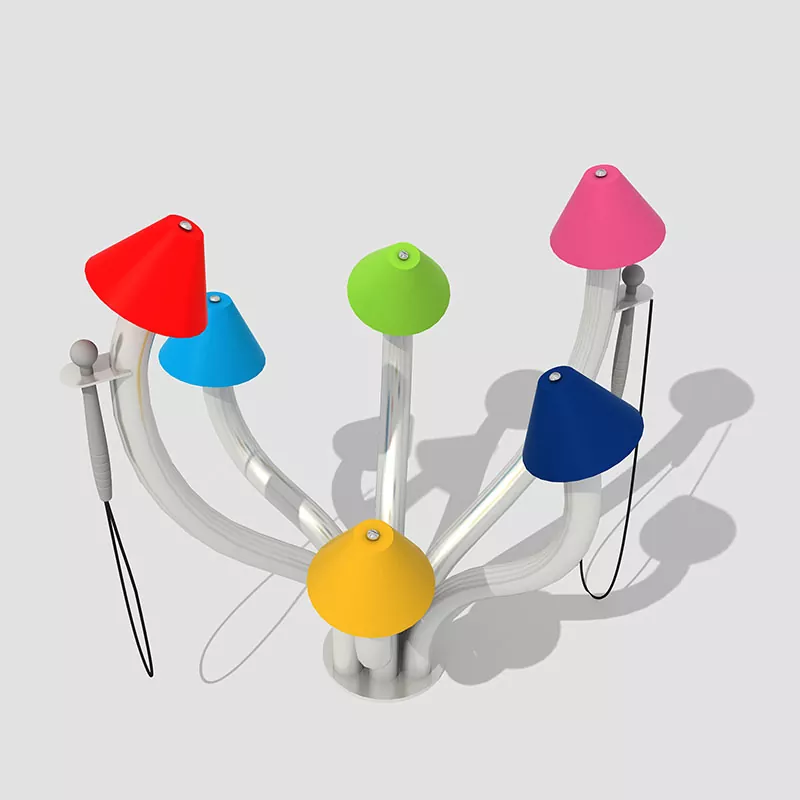 Ένα σετ έξι κωνικών «καπέλων» με επίστρωση πούδρας με ζωηρά χρώματα, με κυματοειδείς ράβδους από ανοξείδωτο χάλυβα σε διαφορετικά ύψη και γωνίες, καθιστώντας το ένα εντυπωσιακό στοιχείο που σύντομα θα γίνει το πιο δημοφιλές.
